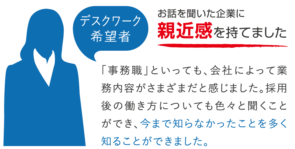Web業界と言っても職種は様々。ディレクター・クリエイター・マーケッター・解析士・営業・事務員などなど。まずは、企業とお話することで仕事内容を知っていただき、自身の経歴を活かせるポイントを見つけましょう。